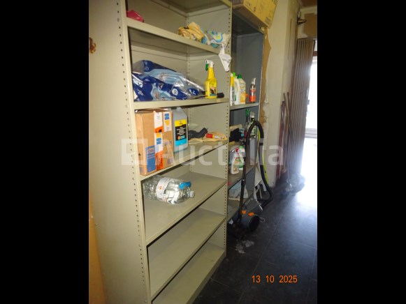 1 metalen ladder Aantal treden: 3 Kleur: wit 1 heggenschaar 1 sledestofzuiger Merk: ZEEGMA 1 sledestofzuiger Merk: HOOVER 2 metalen legborden inclusief diverse navulproducten voor TORK apparaat, jerrycan, diverse verzorgingsproducten hoogte +/- 220