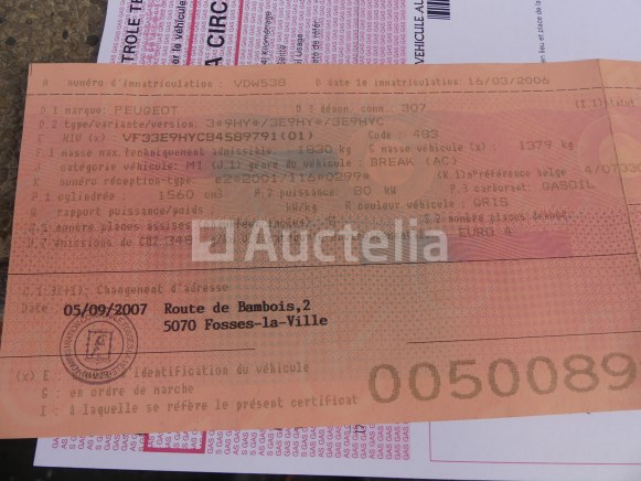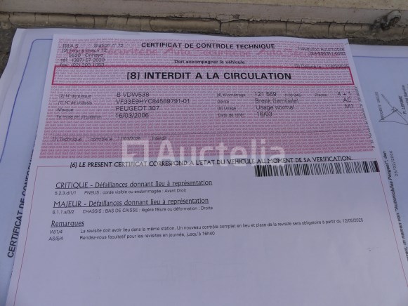 Auto Merk : Peugeot Model: 307 SW Jaar: 2006 Vermogen: 80 watt Datum 1e inschrijving: 16-03-06 Brandstof: Diesel Verplaatsing (cm³) : 1560 Versnellingsbak: Handgeschakeld Airconditioning: Handmatig Radio: Ja Aantal toetsen: 1 Aantal zitplaatsen: 5 Certificaat van overeenstemming: Ja Certificaat van keuring bij de technische keuring: Nee Bewijs van inschrijving deel 1: Ja Kentekenbewijs Deel 2: geen Voertuig nog in dienst (kilometerstand evolueert): Nee Chassisnummer: VF33E9HYC84589791 Euronorm: 4 Staat: Niet getest Het voertuig is niet gestart tijdens de inventarisatie Loopt niet bij het ophalen Geleverd zonder kenteken Laatst bekende kilometerstand: 121626 km per 11/03/2025 Bekende gebreken: Lege batterij Rode kaart bij de technische keuring Aanbevolen bezoek Opmerkingen: Het voertuig heeft tijdens de inventarisatie geen grondige inspectie ondergaan en kan niet-zichtbare gebreken vertonen De koper wordt verondersteld het kavel vóór zijn veiling te hebben bezocht om het materiaal en de logistiek te plannen die nodig zijn voor het ophalen van zijn aankoop.