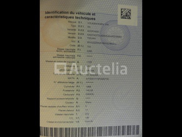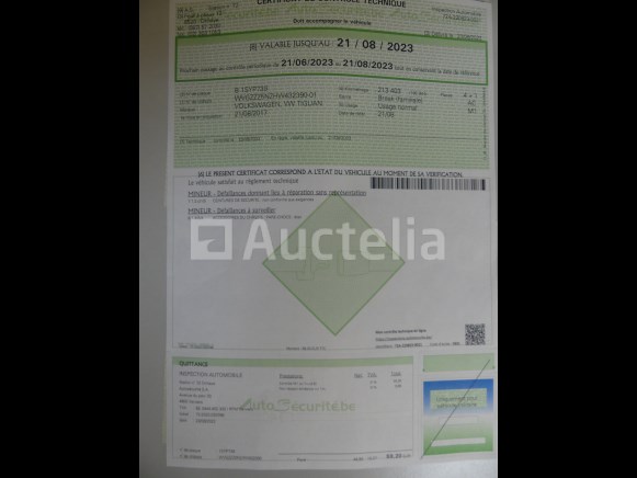 Auto Merk: Volkswagen Model: Tiguan Jaar: 2017 Kilometerstand: 238726 Vermogen: 140 kW Datum 1e inschrijving: 21-08-17 Brandstof: Diesel Verplaatsing (cc) : 1968 Versnellingsbak: Handgeschakeld Airconditioning: Handmatig Radio: Ja Aantal toetsen: 1 Aantal zitplaatsen: 5 Certificaat van overeenstemming: Ja Certificaat technische keuring: Ja Technisch keuringscertificaat geldig tot: : 21-08-23 Bewijs van inschrijving deel 1: Ja Bewijs van inschrijving deel 2: Ja Voertuig nog in dienst (kilometerstand evolueert): Nee Chassisnummer: WVGZZZ5NZHW432390 Euronorm: 6b Staat: Niet getest Het voertuig startte tijdens de inventarisatie Rollen bij pick-up Geleverd zonder kenteken Aanbevolen bezoek Opmerkingen: Het voertuig heeft tijdens de inventarisatie geen grondige inspectie ondergaan en kan niet-zichtbare gebreken vertonen De koper wordt verondersteld het kavel vóór zijn veiling te hebben bezocht om het materiaal en de logistiek te plannen die nodig zijn voor het ophalen van zijn aankoop.