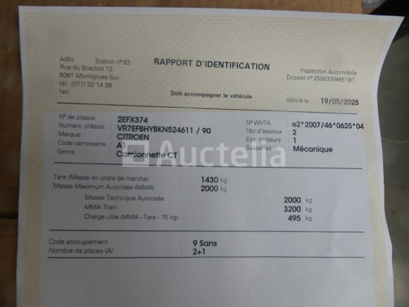 Utilitaire Merk : Citroën Model: Berlingo Jaar: 2020 Kilometerstand: 137385 Vermogen: 73 kW Datum van 1e inschrijving: 11-02-20 Brandstof: Diesel Verplaatsing (cm³) : 1560 Versnellingsbak: Handgeschakeld Radio: Ja Achteruitrijradar: Ja Aantal toetsen: 2 Aantal zitplaatsen: 3 Certificaat van overeenstemming: Ja Certificaat van keuring bij de technische keuring: Nee Bewijs van inschrijving deel 1: Ja Bewijs van inschrijving deel 2: Ja Voertuig nog in dienst (kilometerstand evolueert): Nee Chassisnummer: VR7EFBHYBKN524611 Euronorm: 6b Status: Functioneel op Inventarisatiedag Opmerkingen: Het zal opnieuw worden onderzocht voor verkoop