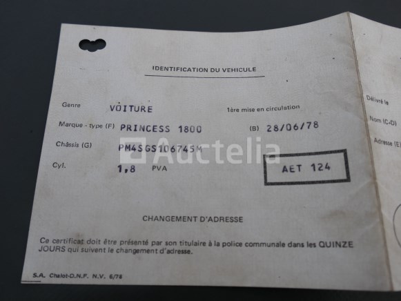 Antieke auto te restaureren Merk: Austin Model: Prinses Jaar: 1978 Kilometerstand : 46112 Datum van 1e inschrijving: 28-06-78 Verplaatsing (cm³) : 1800 Transmissie: handgeschakelde 4 versnellingen Certificaat van overeenstemming: Ja Certificaat technische keuring: Ja Technisch keuringscertificaat geldig tot: : 28-06-91 Bewijs van inschrijving deel 1: Ja Bewijs van inschrijving deel 2: Ja Chassisnummer: PM4SGS106745M Getest: Nee Staat: op te knappen Opmerkingen: Aanbevolen bezoek
