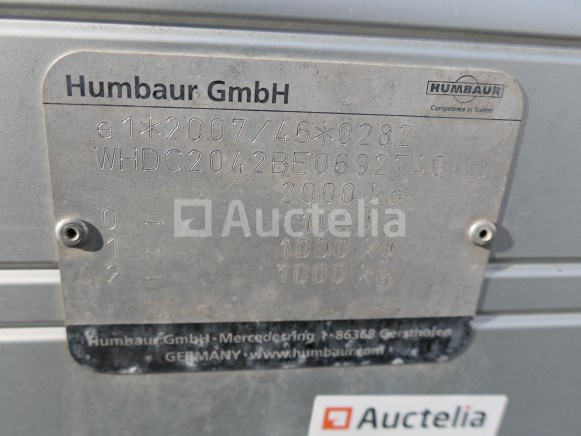 Dubbelassige aanhangwagen met vaste zijkanten Merk: Humbaur Model: HA TA G A15 Jaar: 2015 Lengte: 394 cm Breedte: 181 cm Hoogte: 904 cm Gewicht: 330 kg Datum van 1e inschrijving: 16-01-15 MMA: 2000 kg Tarra: 330 kg Certificaat van overeenstemming: Ja Certificaat technische keuring: Ja Technisch keuringscertificaat geldig tot: : 16-07-18 Bewijs van inschrijving deel 1: Ja Chassisnummer: WHDC2042BE0692740 Capaciteit: 1670 kg Getest: Nee Luxemburgse documenten Opmerkingen: Aanbevolen bezoek