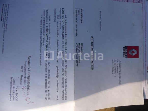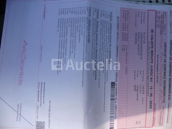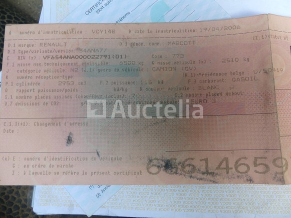 Bestelwagen met dubbele cabine en driewegbed Merk : Renault Model: Mascott 160 Jaar: 2006 Kilometerstand: 148619 Vermogen: 115 kW Datum 1e inschrijving: 19-04-06 Brandstof: Diesel Verplaatsing (cm³) : 2953 Versnellingsbak: Handgeschakeld Aantal toetsen: 1 Zitplaatsen: 7 Certificaat van overeenstemming: Ja Certificaat technische keuring: Ja Technisch keuringscertificaat geldig tot: : 15-05-25 Bewijs van inschrijving deel 1: Ja Kentekenbewijs Deel 2: geen Voertuig nog in dienst (kilometerstand evolueert): Nee Chassisnummer: VF654ANA000022791 Euro Standaard: 3 Staat: op te knappen Lege batterij Laatst bekende kilometerstand info bij technische keuring van 30/04/2025 Ongeldige technische keuring (rode kaart) Loopt niet bij het ophalen Aanzienlijke oxidatie op het frame Opmerkingen: Aanbevolen bezoek
