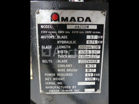 Kettingzaag Merk: Amada Model: HA250W Jaar: 1999 Spanning: 400V driefasig Lengte: 180 cm Breedte: 195 cm Hoogte: 170 cm Gewicht: 1200 kg Vermogen: 4,45 kW Conditie: Niet getest Opmerkingen: Aanbevolen bezoek
