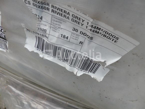 Verkoop van tegels 60x60 keramiek Model: Grijze Rivièra Lengte: 60 cm Breedte: 60 cm Aantal :+/- 148 Gerectificeerde keramische tegels Kleur: betongrijs 37 doosjes van 4 stuks Batch verspreid over een pallet