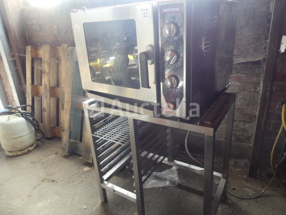 RVS combi stoomoven Merk: Inoxtrend Model: E2 RDA-105E Spanning: 400V driefasig Lengte: 84 cm Breedte: 72 cm Hoogte: 58 cm Vermogen: 6 kW Staat: Niet getest 5 binnenniveaus Geleverd met zijn roestvrijstalen steuntafel Afmetingen van de steun: 90x55x90 cm