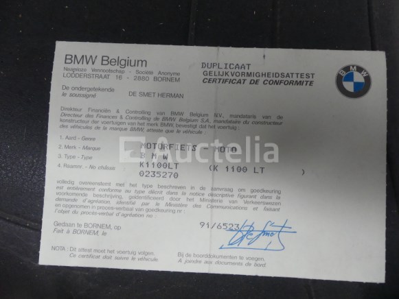 Motorfiets Merk : BMW Model: K1100LT Jaar: 1997 Kilometerstand: 111517 Datum van 1e inschrijving: 16-07-97 Verplaatsing (cc³) : 1092 Aantal toetsen: 1 Certificaat van overeenstemming: Ja Bewijs van inschrijving deel 1: Ja Kentekenbewijs Deel 2: geen Voertuig nog in dienst (kilometerstand evolueert): Nee Chassisnummer: 0235270 Staat: Niet getest Lege batterij Opmerkingen: Aanbevolen bezoek