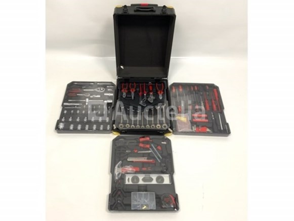 Aluminium: ja; met inhoud: ja; afmeting L: 210 mm; afmeting B: 370 mm; afmeting H: 520 mm; omschrijving: 186 delig; w.o. steek- ringsleutel met ratel; diverse tangen; doppenset met ratel; diverse schroevendraaiers; precisieschroevendraaiers; inbussleutel; diverse bits; klauwhamer; krimptang; schaar; rolmaat; waterpas; hetelijmpistool; kunststof klemmen; tapijtmes;
