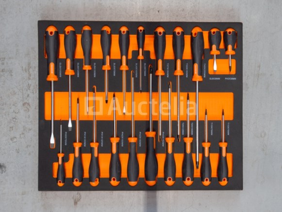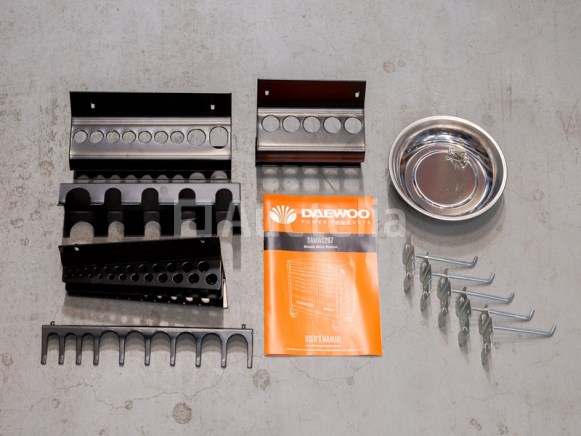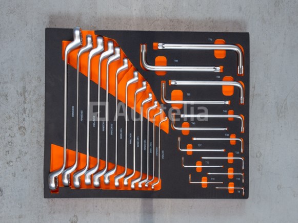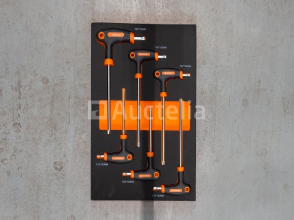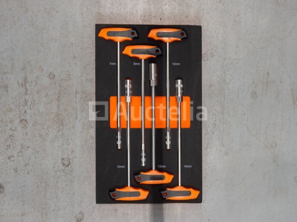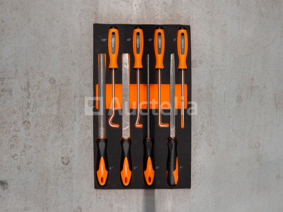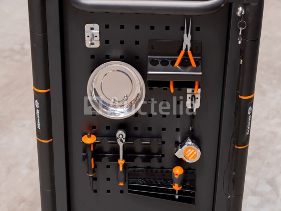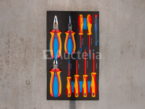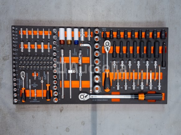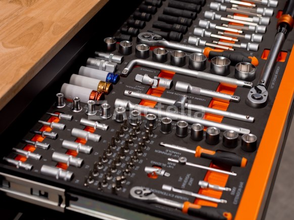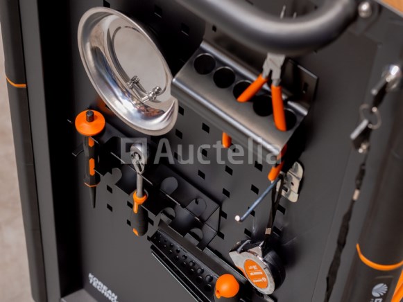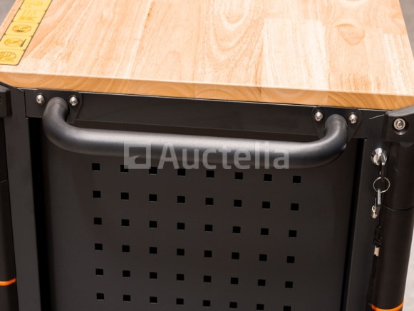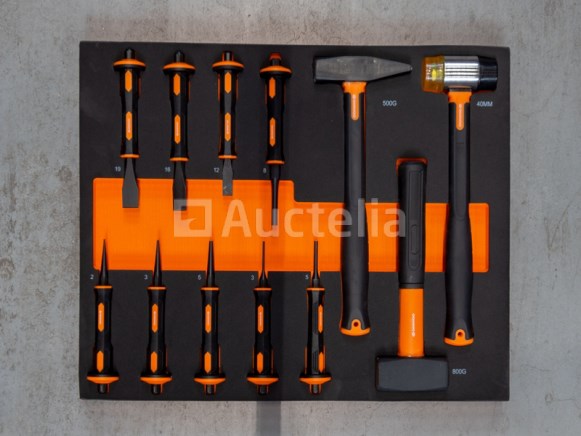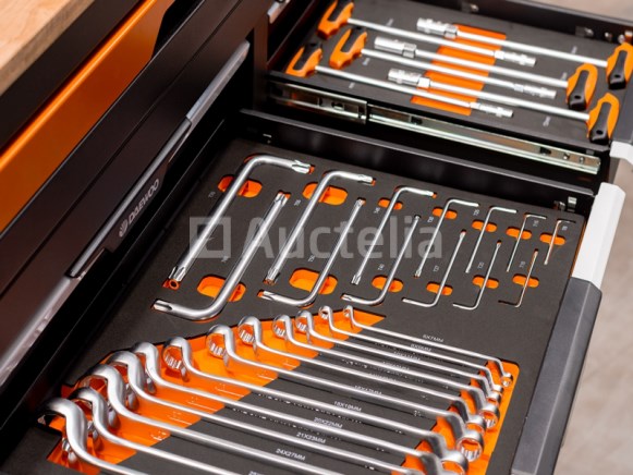 267 delig; 13 lades waarvan 11 lades gevuld; 12 tangen; 12 hamers; 8 Files ; 6 zeshoek sleutels; 6 T-Handle ; 21 schroevendraaiers; 40 steeksleutels; 10 imbus sleutels; 127 doppen en bitjes; 25 sleutels ; houten werkblad; verrijdbaar; remmen; 2 delen afsluitbaar