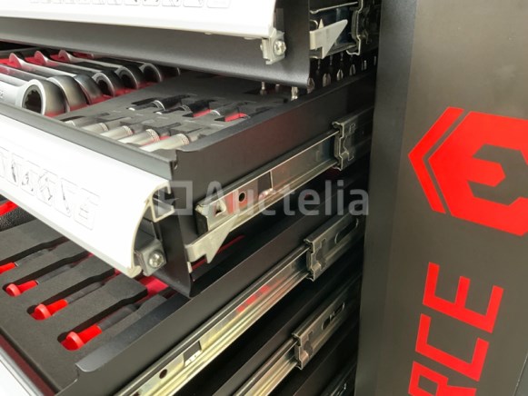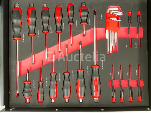 4 laden gevuld; verrijdbaar; afsluitbaar; lade 1 Doppenset 1/2” en 1/4” 4 tot en met 32 en toebehoren; Lade 2 steek ringsleutelset 8 tot en met 22 torx imbusset bitjes; lade 3 schroevendraaiers en imbusset; lade 4 tangen, hamer, pendrijvers; lade 4 & 5 zijn leeg voor opslag; 5769