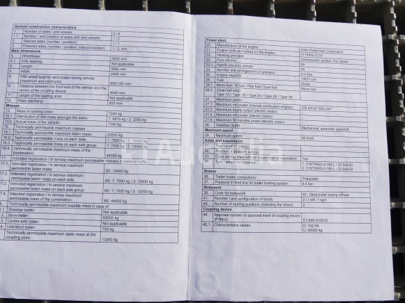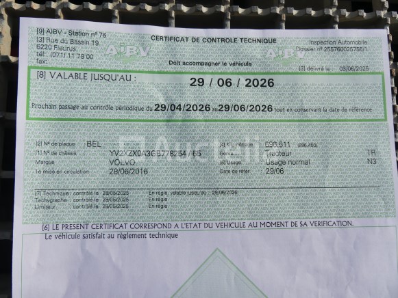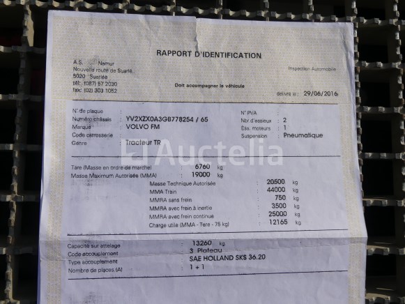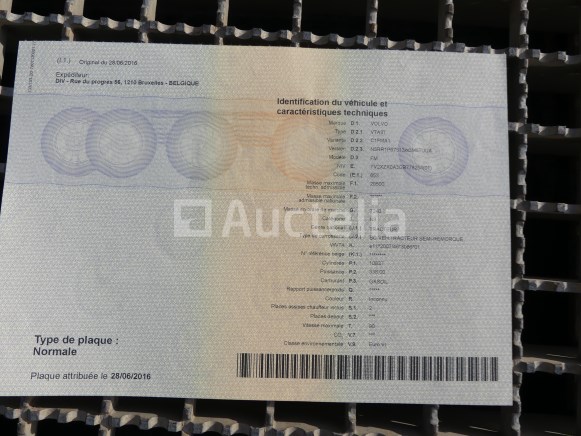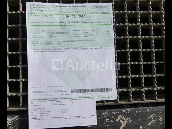 Weg tractor Merk: Volvo Model: FM Jaar: 2016 Kilometerstand: 713949 Lengte: 300 cm Breedte: 250 cm Hoogte: 390 cm Vermogen: 338 kW Datum 1e inschrijving: 28-06-16 Brandstof: Diesel Verplaatsing (cm³) : 10837 Versnellingsbak: Automaat MMA: 19000 kg Ledig gewicht: 6760 kg Wielbasis: 380 cm Ophanging: Pneumatisch Airconditioning: Automaat Radio: Ja Aantal toetsen: 2 Aantal zitplaatsen: 2 Certificaat van overeenstemming: Ja Certificaat technische keuring: Ja Technisch keuringscertificaat geldig tot: 29-06-26 Bewijs van inschrijving deel 1: Ja Bewijs van inschrijving deel 2: Ja Identificatierapport: Ja Voertuig nog in dienst (kilometerstand evolueert): Nee Chassisnummer: YV2XZX0A3GB778254 Euro Standaard: 6 Status: Gestart op inventarisatiedag Opmerkingen: Het voertuig heeft tijdens de inventarisatie geen grondige inspectie ondergaan en kan niet-zichtbare gebreken vertonen. De koper wordt verondersteld het kavel vóór de aankoop te hebben bezocht om de eventuele afhandeling van zijn kavel te plannen