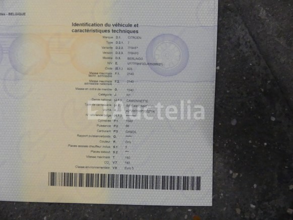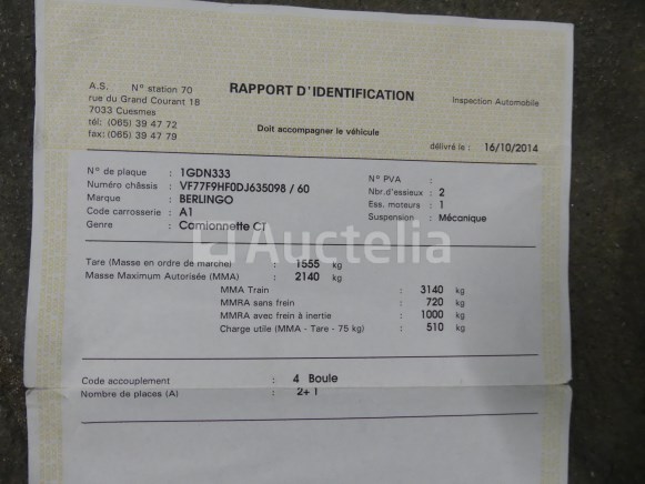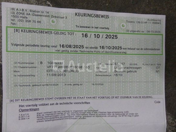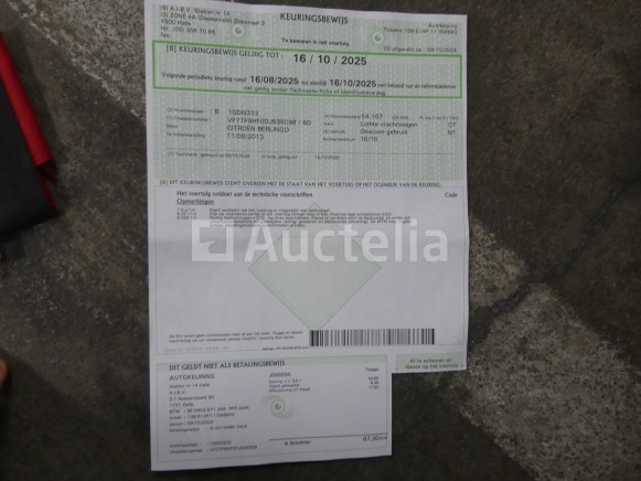 Utilitaire Merk : Citroën Model: Berlingo Jaar: 2013 Kilometerstand : 55041 Vermogen: 66 kW Datum van 1e inschrijving: 11-09-13 Brandstof: Diesel Verplaatsing (cm³) : 1560 Versnellingsbak: Handgeschakeld Airconditioning: Handmatig Radio: Ja Aantal toetsen: 1 Aantal zitplaatsen: 3 Certificaat van overeenstemming: Ja Certificaat technische keuring: Ja Technisch keuringscertificaat geldig tot: : 16-10-25 Bewijs van inschrijving deel 1: Ja Bewijs van inschrijving deel 2: Ja Voertuig nog in dienst (kilometerstand evolueert): Nee Chassisnummer: VF77F9HF0DJ635098 Euronorm: 5 Status: Functioneel op Inventarisatiedag Opmerkingen: Het voertuig heeft tijdens de inventarisatie geen grondige inspectie ondergaan en kan niet-zichtbare gebreken vertonen. De koper wordt verondersteld het kavel vóór de aankoop te hebben bezocht om de eventuele afhaling van zijn kavel te plannen.