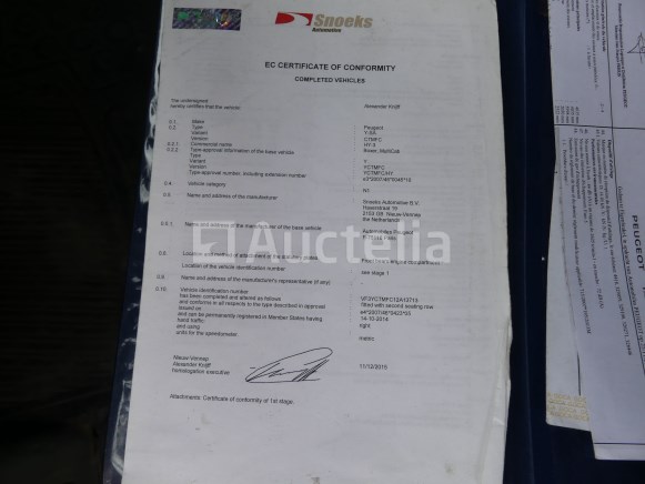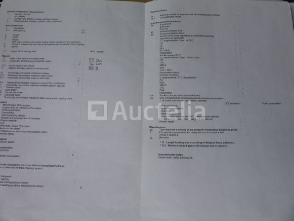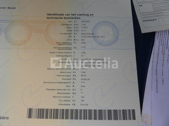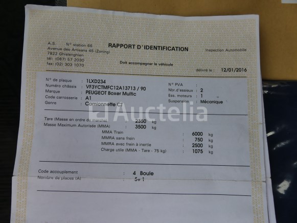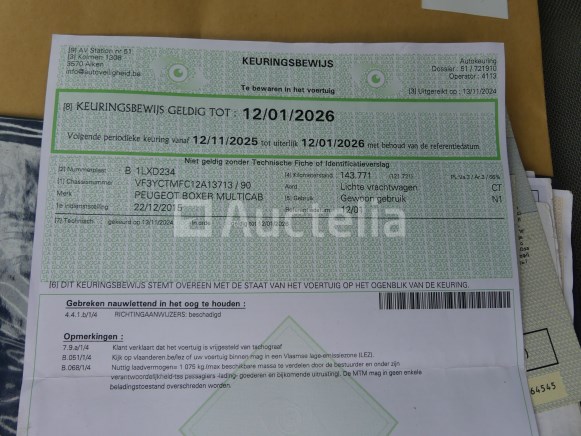 Bestelwagen Merk : Peugeot Model: Boxer multicab Jaar: 2015 Kilometerstand : 159750 Vermogen: 96 kW Datum 1e inschrijving: 22-12-15 Brandstof: Diesel Verplaatsing (cc) : 2198 Versnellingsbak: Handgeschakeld Radio: Ja Achteruitrijradar: Ja Aantal toetsen: 1 Aantal zitplaatsen: 6 Certificaat van overeenstemming: Ja Certificaat technische keuring: Ja Technisch keuringscertificaat geldig tot: : 12-01-26 Bewijs van inschrijving deel 1: Ja Bewijs van inschrijving deel 2: Ja Voertuig nog in dienst (kilometerstand evolueert): Nee Chassisnummer: VF3YCTMFC12A13713 Euronorm: 5b Status: Functioneel op Inventarisatiedag Opmerkingen: Het voertuig heeft tijdens de inventarisatie geen grondige inspectie ondergaan en kan niet-zichtbare gebreken vertonen. De koper wordt verondersteld het kavel vóór de aankoop te hebben bezocht om de eventuele afhaling van zijn kavel te plannen.