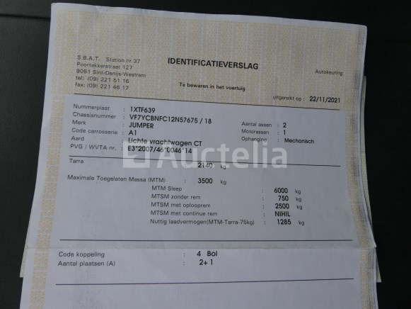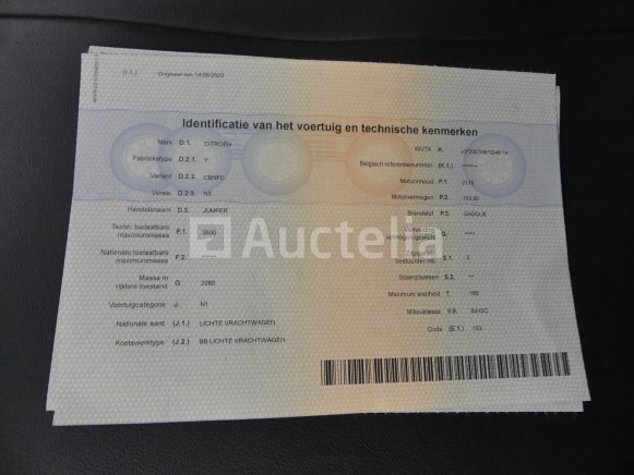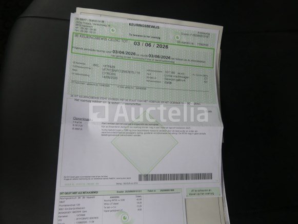 Bestelwagen Merk : Citroën Model: Trui Jaar: 2020 Kilometerstand : 109780 Vermogen: 103 kW Datum van 1e inschrijving: 14-05-20 Brandstof: Diesel Verplaatsing (cc) : 2179 Versnellingsbak: Handgeschakeld Airconditioning: Handmatig Radio: Ja Achteruitrijradar: Ja Aantal toetsen: 1 Aantal zitplaatsen: 3 Certificaat van overeenstemming: Ja Certificaat technische keuring: Ja Technisch keuringscertificaat geldig tot: : 03-06-26 Bewijs van inschrijving deel 1: Ja Bewijs van inschrijving deel 2: Ja Voertuig nog in dienst (kilometerstand evolueert): Nee Chassisnummer: VF7YCBNFC12N57675 Euro Standaard: 6d Status: Functioneel op Inventarisatiedag Opmerkingen: Het voertuig heeft tijdens de inventarisatie geen grondige inspectie ondergaan en kan niet-zichtbare gebreken vertonen. De koper wordt verondersteld het kavel vóór de aankoop te hebben bezocht om de eventuele afhaling van zijn kavel te plannen.