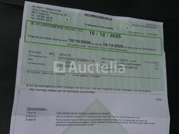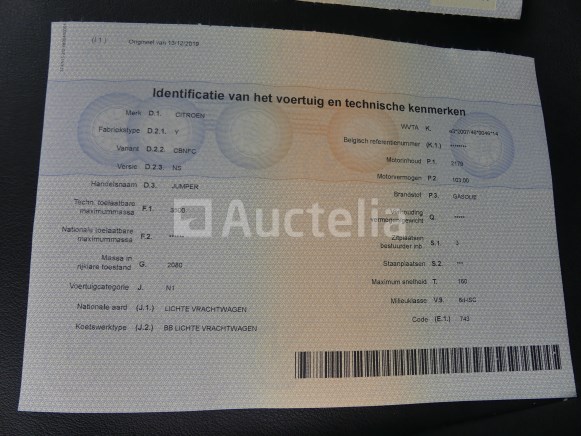 Bestelwagen Merk : Citroën Model: Trui Jaar: 2019 Kilometerstand: 135824 Vermogen: 103 kW Datum van 1e inschrijving: 13-12-19 Brandstof: Diesel Verplaatsing (cc) : 2179 Versnellingsbak: Handgeschakeld Airconditioning: Handmatig Radio: Ja Achteruitrijradar: Ja Aantal toetsen: 2 Aantal zitplaatsen: 3 Certificaat van overeenstemming: Ja Certificaat technische keuring: Ja Technisch keuringscertificaat geldig tot: : 15-12-25 Bewijs van inschrijving deel 1: Ja Bewijs van inschrijving deel 2: Ja Voertuig nog in dienst (kilometerstand evolueert): Nee Chassisnummer: VR7YCBNFC12N00001 Euro Standaard: 6d Status: Functioneel op Inventarisatiedag Opmerkingen: Het voertuig heeft tijdens de inventarisatie geen grondige inspectie ondergaan en kan niet-zichtbare gebreken vertonen. De koper wordt verondersteld het kavel vóór de aankoop te hebben bezocht om de eventuele afhaling van zijn kavel te plannen.