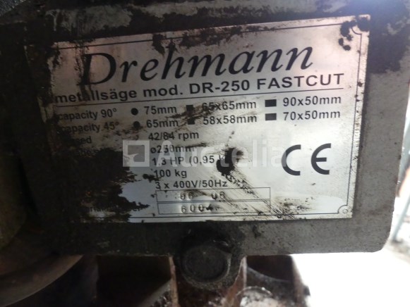 Metalen kettingzaag Merk: Drehmann Model: DR250 Spanning: 400V driefasig Lengte: 55 cm Breedte: 90 cm Hoogte: 140 cm Gewicht: 100 kg Staat: Niet getest Functioneel volgens verkoper Opmerkingen: Aanbevolen bezoek