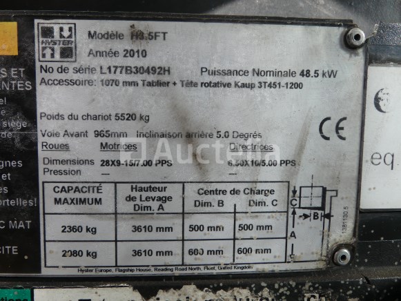 Vorkheftruck Merk: Hyster Model: H1,5 FT Jaar: 2010 Lengte: 430 cm Breedte: 115 cm Hoogte: 245 cm Gewicht: 5520 kg Voortstuwing: Thermisch Hefvermogen: 2360 kg Vermogen: 48,5 kW Intern verkopersnummer (Ref): 1450 Vorklengte: 120 cm Masttype: Duplex Lifthoogte: 360 cm Aantal wielen: 4 Conditie: Niet getest Laatst bekende tijd: 4356 (07-24)