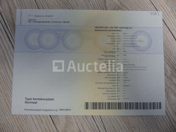 Boxtruck Merk: Iveco Model: Eurocargo Jaar: 2008 Kilometerstand: 211055 Lengte: 775 cm Breedte: 255 cm Hoogte: 335 cm Vermogen: 134 kW Datum van 1e inschrijving: 01-09-08 Brandstof: Diesel Cilinderinhoud (cc): 3920 Versnellingsbak: Handgeschakeld MMA: 7490 kg Radio: Ja Aantal toetsen: 1 Aantal zetels: 3 Conformiteitscertificaat: Nee Inspectiecertificaat bij de technische inspectie: Nee Registratiecertificaat Deel 1: Nee Registratiebewijs Deel 2: Ja Vrachtwagengegevensblad: Nee Identificatierapport: Nee Voertuig nog in gebruik (kilometerstand verandert): Nee Chassisnummer: ZCFA75D0302541767 Intern verkopersnummer (Ref): 7524 Status: Functioneel op Inventarisatiedag Doos Merk: Junger Jaar: 2008 Afmetingen: 605 cm x 255 cm x 240 cm Luik Afmetingen: 250 cm x 180 cm Opmerkingen: Het voertuig is tijdens de inventarisatie niet grondig geïnspecteerd en kan niet-zichtbare defecten hebben. De koper zou het perceel vóór de aankoop hebben bezocht om eventuele afwikkeling van zijn perceel te plannen.