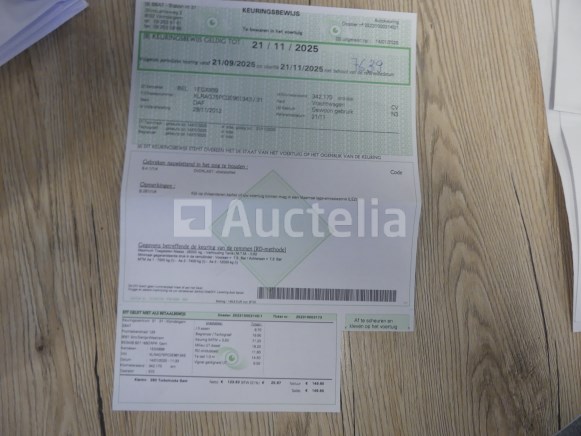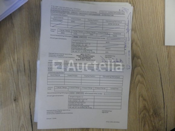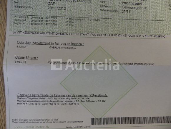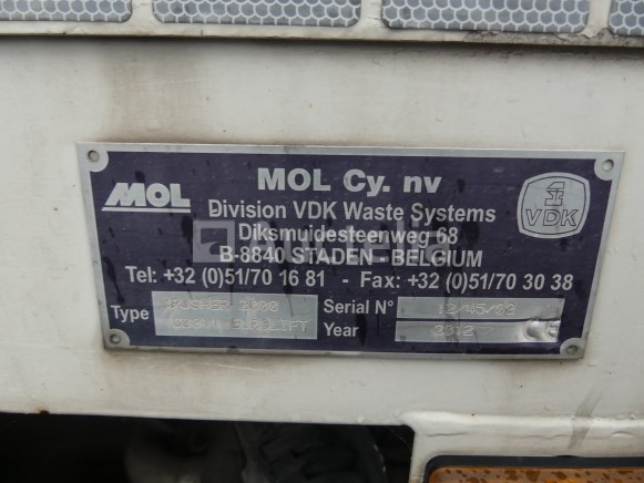 Vuilniswagen Merk: DAF Model: FAGCF75 Jaar: 2012 Kilometerstand: 357430 Lengte: 945 cm Breedte: 255 cm Hoogte: 340 cm Vermogen: 183 kW Datum van eerste inschrijving: 29-11-12 Brandstof: Diesel Verplaatsing (cc): 9156 Versnellingsbak: Automatisch MMA: 26.000 kg Eigengewicht: 16200 kg Wielbasis: 467 cm Ophanging: Pneumatisch Radio: Ja Aantal toetsen: 1 Aantal zetels: 2 Certificaat van conformiteit: Ja Technisch keuringscertificaat: Ja Technisch keuringscertificaat geldig tot: 21-11-25 Registratiecertificaat Deel 1: Ja Registratiebewijs Deel 2: Ja Vrachtwagengegevens: Ja Identificatierapport: Ja Voertuig nog in gebruik (kilometerstand verandert): Nee Chassisnummer: XLRAG75PCOE961343 Eurostandaard: 5 Intern verkopersnummer (Ref): 7639 Status: Functioneel op Inventarisatiedag Hydraulisch perssysteem Merk: VDK Model: Pusher 2000 CB011 Eurolift Afmetingen: 705 cm 255 cm x 220 cm Opmerkingen: Het voertuig is tijdens de inventarisatie niet grondig geïnspecteerd en kan niet-zichtbare defecten hebben. De koper zou het perceel vóór de aankoop hebben bezocht om eventuele afwikkeling van zijn perceel te plannen.