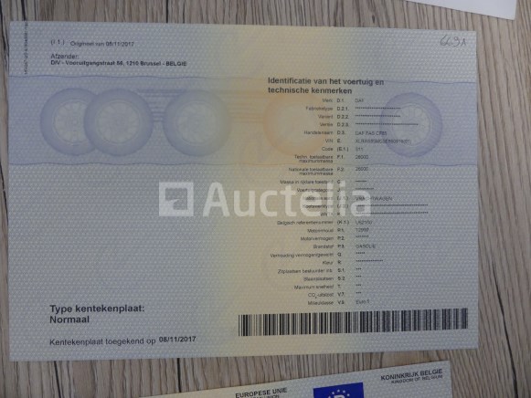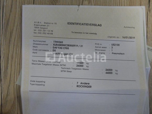Containervrachtwagen Merk: DAF Model: FAS CF85 Jaar: 2009 Lengte: 860 cm Breedte: 255 cm Hoogte: 315 cm Datum van 1e inschrijving: 18-02-09 Brandstof: Diesel Verplaatsing (cm³): 12.900 Versnellingsbak: Automatisch MMA: 26.000 kg Eigengewicht: 17420 kg Wielbasis: 530 cm Ophanging: Pneumatisch Radio: Ja Aantal sleutels: 0 Aantal zetels: 2 Certificaat van conformiteit: Ja Technisch keuringscertificaat: Ja Technisch keuringscertificaat geldig tot: 25-01-22 Registratiecertificaat Deel 1: Ja Registratiebewijs Deel 2: Ja Vrachtwagengegevens: Ja Identificatierapport: Ja Voertuig nog in gebruik (kilometerstand verandert): Nee Chassisnummer: XLRAS85MCOE850919 Eurostandaard: 5 Intern verkopersnummer (Ref): 6691 Conditie: Niet getest Opmerkingen: Het voertuig is tijdens de inventarisatie niet grondig geïnspecteerd en kan niet-zichtbare defecten hebben. De koper zou het perceel vóór de aankoop hebben bezocht om eventuele afwikkeling van zijn perceel te plannen.