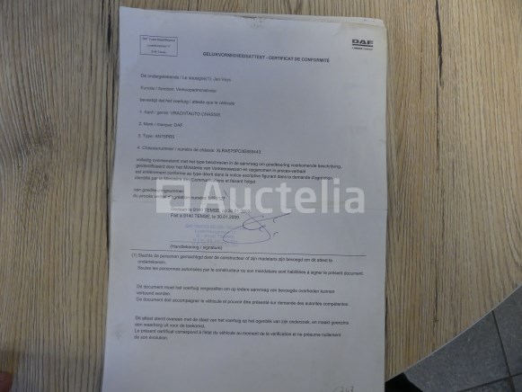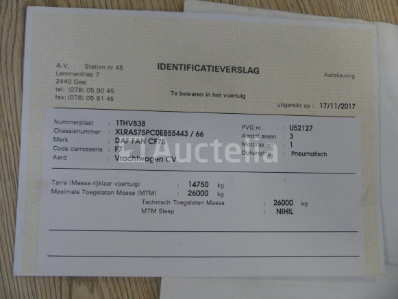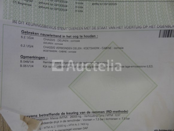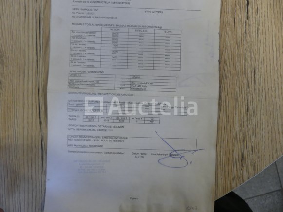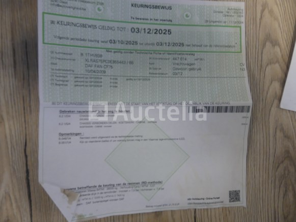 Vuilniswagen Merk: DAF Model: FAN CF75 Jaar: 2009 Kilometerstand: 465712 Lengte: 970 cm Breedte: 255 cm Hoogte: 370 cm Vermogen: 183 kW Datum van 1e inschrijving: 10-04-09 Brandstof: Diesel Verplaatsing (cc): 9188 Versnellingsbak: Automatisch MMA: 26.000 kg Gewicht: 14750 kg Wielbasis: 490 cm Ophanging: Pneumatisch Radio: Ja Aantal toetsen: 2 Aantal zetels: 3 Certificaat van conformiteit: Ja Technisch keuringscertificaat: Ja Technisch keuringscertificaat geldig tot: 03-12-25 Registratiecertificaat Deel 1: Ja Registratiebewijs Deel 2: Ja Vrachtwagengegevens: Ja Identificatierapport: Ja Voertuig nog in gebruik (kilometerstand verandert): Nee Chassisnummer: XLRAS75PCOE855443 Eurostandaard: 5 Intern verkopersnummer (Ref): 6747 Status: Functioneel op Inventarisatiedag Hydraulisch perssysteem Merk: VDK Model: Max 3000 Jaar: 2009 Afmetingen: 740 cm x 255 cm x 240 cm Opmerkingen: Het voertuig is tijdens de inventarisatie niet grondig geïnspecteerd en kan niet-zichtbare defecten hebben. De koper zou het perceel vóór de aankoop hebben bezocht om eventuele afwikkeling van zijn perceel te plannen.