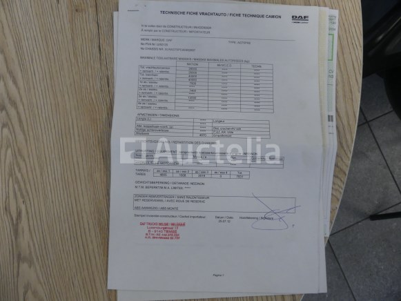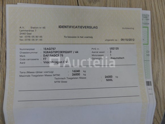 Vuilniswagen Merk: DAF Model: FAG CF75 Jaar: 2012 Kilometerstand: 484617 Lengte: 950 cm Breedte: 255 cm Hoogte: 330 cm Vermogen: 183 kW Datum van eerste inschrijving: 10-02-12 Brandstof: Diesel Verplaatsing (cc): 9186 Versnellingsbak: Automatisch MMA: 26.000 kg Leergewicht: 16240 kg Wielbasis: 467 cm Ophanging: Pneumatisch Radio: Ja Aantal toetsen: 2 Aantal zetels: 2 Certificaat van conformiteit: Ja Technisch keuringscertificaat: Ja Technisch keuringscertificaat geldig tot: 25-09-10- Registratiecertificaat Deel 1: Ja Registratiebewijs Deel 2: Ja Vrachtwagengegevens: Ja Identificatierapport: Ja Voertuig nog in gebruik (kilometerstand verandert): Nee Chassisnummer: XLRAG75PCOE952697 Eurostandaard: 5 Intern verkopersnummer (Ref): 7605 Status: Functioneel op Inventarisatiedag Hydraulisch perssysteem Merk: VDK Model: Pusher 2000 CBO11 Eurolift Jaar: 2012 Afmetingen: 720 cm x 255 cm x 200 cm Opmerkingen: Het voertuig is tijdens de inventarisatie niet grondig geïnspecteerd en kan niet-zichtbare defecten hebben. De koper zou het perceel vóór de aankoop hebben bezocht om eventuele afwikkeling van zijn perceel te plannen.