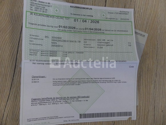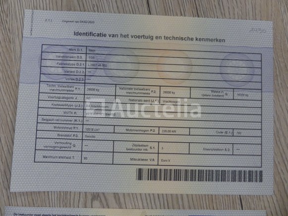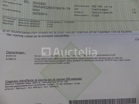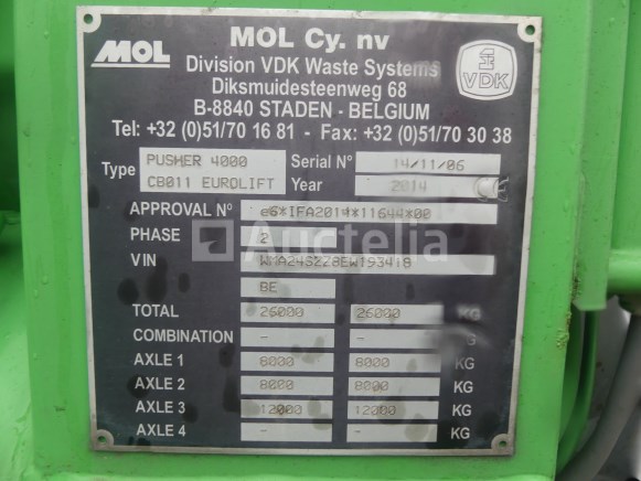 Vuilniswagen Merk: MAN Model: TGS Jaar: 2014 Kilometerstand: 438260 Lengte: 1000 cm Breedte: 255 cm Hoogte: 350 cm Vermogen: 235 kW Datum van eerste inschrijving: 24-03-14 Brandstof: Diesel Verplaatsing (cc³): 10518 Versnellingsbak: Automatisch MMA: 26.000 kg Eigengewicht: 16050 kg Wielbasis: 550 cm Ophanging: Pneumatisch Airconditioning: Automatisch Radio: Ja Aantal toetsen: 2 Aantal zetels: 3 Certificaat van conformiteit: Ja Technisch keuringscertificaat: Ja Technisch keuringscertificaat geldig tot: 01-04-26 Registratiecertificaat Deel 1: Ja Registratiebewijs Deel 2: Ja Identificatierapport: Ja Voertuig nog in gebruik (kilometerstand verandert): Nee Chassisnummer: WMA24SZZ8EW193418 Eurostandaard: 5 Intern verkopersnummer (Ref): 1490 Status: Functioneel op Inventarisatiedag Hydraulisch perssysteem Merk: VDK Model: Pusher 4000 CBO11 Eurolift Jaar: 2014 Afmetingen: 710 cm x 255 cm x 210 cm Opmerkingen: Het voertuig is tijdens de inventarisatie niet grondig geïnspecteerd en kan niet-zichtbare defecten hebben. De koper zou het perceel vóór de aankoop hebben bezocht om eventuele afwikkeling van zijn perceel te plannen.