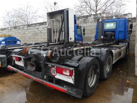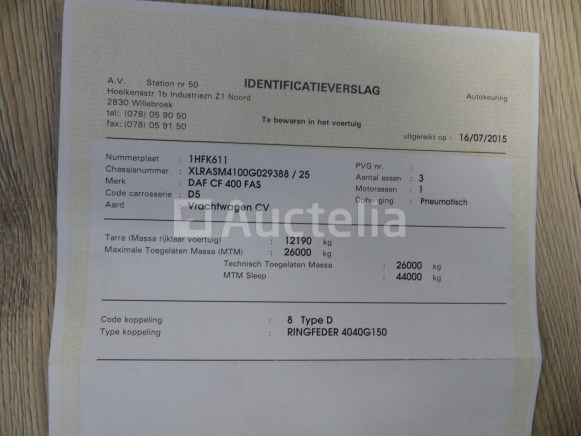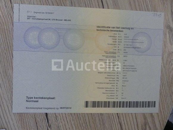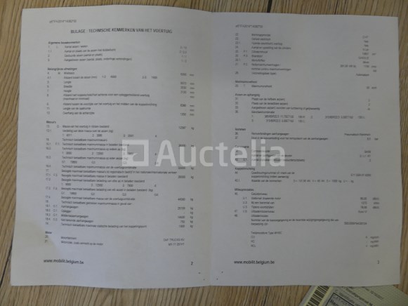 Containervrachtwagen Merk: DAF Model: CF 400 FAS Jaar: 2014 Kilometerstand: 582763 Lengte: 860 cm Breedte: 255 cm Hoogte: 315 cm Vermogen: 291 kW Datum van 1e inschrijving: 07-08-14 Brandstof: Diesel Verplaatsing (cm³): 10837 Versnellingsbak: Automatisch MMA: 26.000 kg Eigengewicht: 12190 kg Wielbasis: 600 cm Ophanging: Pneumatisch Radio: Ja Aantal toetsen: 1 Aantal zetels: 2 Certificaat van conformiteit: Ja Technisch keuringscertificaat: Ja Technisch keuringscertificaat geldig tot: 24-07-24 Registratiecertificaat Deel 1: Ja Registratiebewijs Deel 2: Ja Identificatierapport: Ja Voertuig nog in gebruik (kilometerstand verandert): Nee Chassisnummer: XLRASM4100G029388 Eurostandaard: 6 Intern verkopersnummer (Ref): 7709 Conditie: Niet getest Opmerkingen: Het voertuig is tijdens de inventarisatie niet grondig geïnspecteerd en kan niet-zichtbare defecten hebben. De koper zou het perceel vóór de aankoop hebben bezocht om eventuele afwikkeling van zijn perceel te plannen.