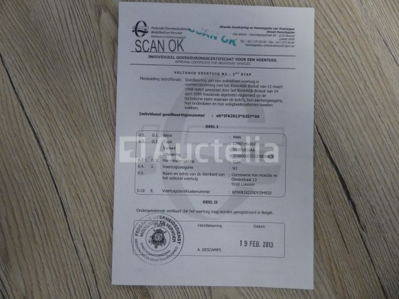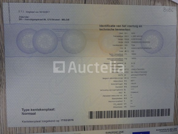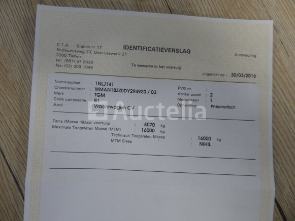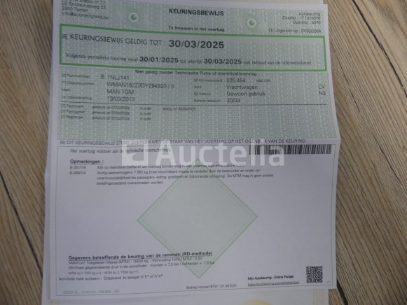 Boxtruck Merk: MAN Model: TGM Jaar: 2013 Lengte: 775 cm Breedte: 250 cm Hoogte: 335 cm Vermogen: 184 kW Datum van eerste inschrijving: 19-03-13 Brandstof: Diesel Verplaatsing (cc): 6871 Versnellingsbak: Automatisch MMA: 16.000 kg Taregewicht: 8070 kg Wielbasis: 577 cm Ophanging: Pneumatisch Airconditioning: Handmatig Radio: Ja Aantal toetsen: 1 Aantal zetels: 2 Certificaat van conformiteit: Ja Technisch keuringscertificaat: Ja Technisch keuringscertificaat geldig tot: 30-03-25 Registratiecertificaat Deel 1: Ja Registratiebewijs Deel 2: Ja Identificatierapport: Ja Voertuig nog in gebruik (kilometerstand verandert): Nee Chassisnummer: WMAN18ZZODY294920 Eurostandaard: 5 Intern verkopersnummer (Ref): 8086 Staat: te worden opgeknapt Doos Afmetingen: 850 cm x 255 cm x 250 cm Luik Merk: Dhollandia Model: DHLM20 Capaciteit: 2000 kg Afmetingen: 245 cm x 200 cm Kardan verwijderd Opmerkingen: Het voertuig is tijdens de inventarisatie niet grondig geïnspecteerd en kan niet-zichtbare defecten hebben. De koper zou het perceel vóór de aankoop hebben bezocht om eventuele afwikkeling van zijn perceel te plannen.