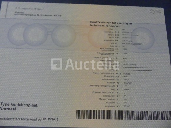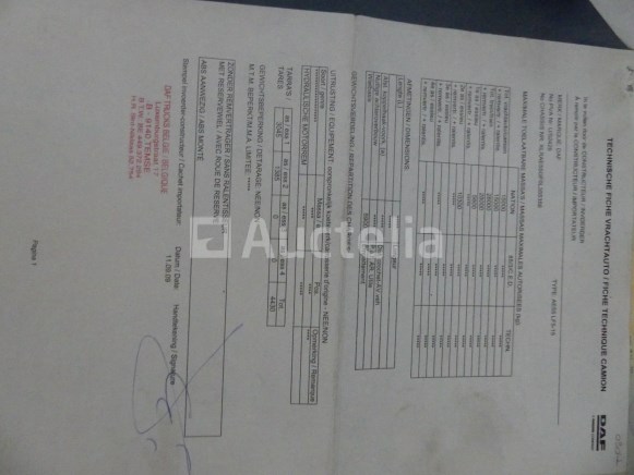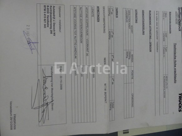 Bakwagen Merk: DAF Model: FA-LF55 Jaar: 2009 Lengte: 10600 cm Breedte: 255 cm Vermogen: 165 kW Datum 1e inschrijving: 08-10-09 Brandstof: Diesel Verplaatsing (cc) : 6693 Versnellingsbak: Automaat MMA: 15000 kg Ledig gewicht : 8010 kg Wielbasis: 590 cm Ophanging: Pneumatisch Radio: Ja Aantal toetsen: 1 Aantal zitplaatsen: 2 Certificaat van overeenstemming: Ja Certificaat technische keuring: Ja Technisch keuringscertificaat geldig tot: : 11-10-25 Bewijs van inschrijving deel 1: Ja Bewijs van inschrijving deel 2: Ja Gegevensblad vrachtwagen : Ja Identificatierapport: Ja Voertuig nog in dienst (kilometerstand evolueert): Nee Chassisnummer: XLRAE55GFOL355356 Euronorm: 5 Intern verkopersnummer (Ref) : 6976 Staat: Niet getest Laatst bekende km: 847014 km