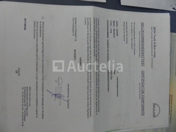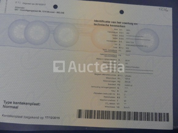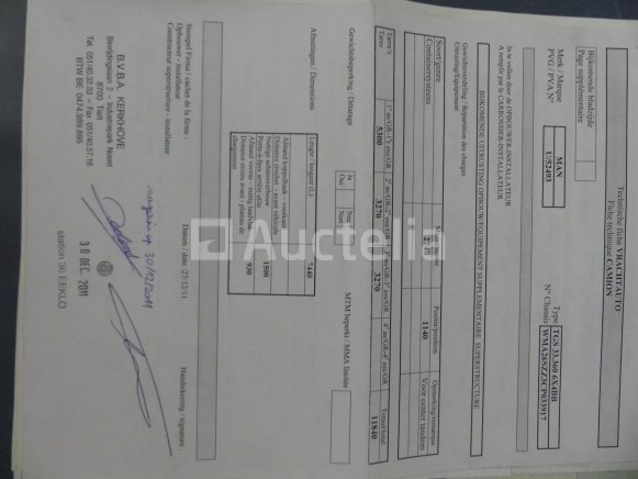 Container vrachtwagen Merk: MAN Model: TGS Jaar: 2011 Kilometerstand: 837710 Lengte: 744 cm Breedte: 255 cm Vermogen: 264 kW Datum van 1e inschrijving: 23-12-11 Brandstof: Diesel Verplaatsing (cc³) : 10516 Versnellingsbak: Handgeschakeld MMA: 26000 kg Tarra: 11840 kg Wielbasis: 430 cm Ophanging: Pneumatisch Airconditioning: Handmatig Radio: Ja Aantal sleutels: GEEN SLEUTEL !! Aantal zitplaatsen: 2 Certificaat van overeenstemming: Ja Certificaat technische keuring: Ja Technisch keuringscertificaat geldig tot: : 30-06-23 Bewijs van inschrijving deel 1: Ja Bewijs van inschrijving deel 2: Ja Gegevensblad vrachtwagen : Ja Identificatierapport: Ja Voertuig nog in dienst (kilometerstand evolueert): Nee Chassisnummer: WMA26SZZ3CP033917 Euronorm: 5 Interne verkoper nummer (Ref) : 1276 Status: Functioneel op Inventarisatiedag