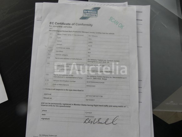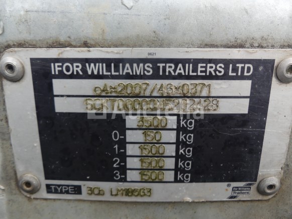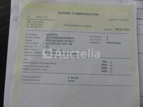 Drieassige aanhangwagen Merk: Ifor Williams Model: DB Jaar: 2022 Lengte: 675 cm Breedte: 200 cm Hoogte: 108 cm Datum van eerste inschrijving: 22-08-03 MMA: 3500 kg Tare: 940 kg Ophanging: Mechanisch Certificaat van conformiteit: Ja Technisch keuringscertificaat: Ja Technisch keuringscertificaat geldig tot: 24-10-10 Registratiecertificaat Deel 1: Nee Registratiecertificaat Deel 2: Nee Chassisnummer: SCKT00000N5202428 Afmetingen van de behuizing: 550 cm x 195 cm x 38 cm Bijgevoegd met beleidsdocument voor verlies van registratiedocumenten