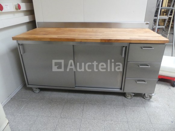 Lengte: 200 cm Breedte: 81 cm Hoogte: 100 cm Op wielen Roestvrijstalen structuur Met 3 lades en 2 schuifdeuren Houten plank Opmerkingen: Aanbevolen bezoek
