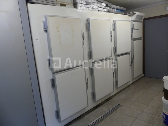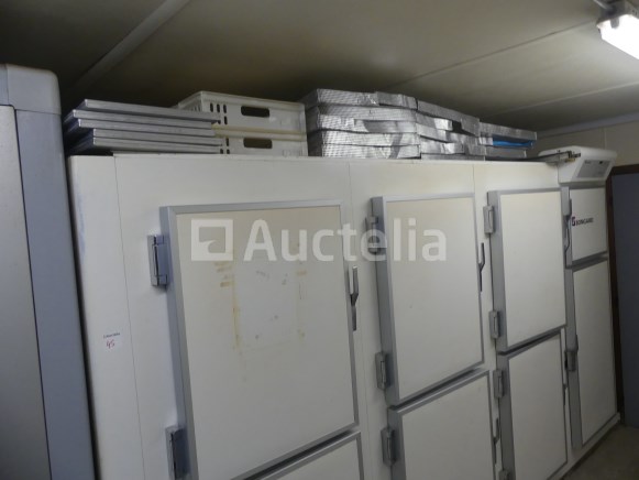 Negatieve koelcel met compartimenten Merk: Bongard Spanning: 400V driefasig Lengte: 375 cm Breedte: 120 cm Hoogte: 215 cm 7 vakken Geleverd met manden en dienbladen Motor uit het midden op het dak Ter plaatse af te koppelen en te demonteren Opmerkingen: Aanbevolen bezoek Afhalen op afspraak