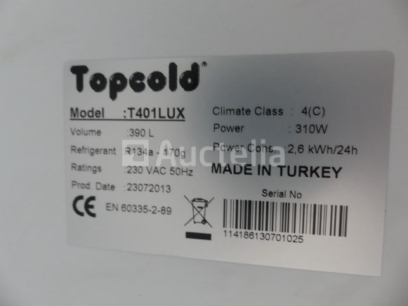 Glazen koelkast Merk: Topcold Model: T401LUX Jaar: 2013 Spanning: 230V Mono Lengte: 59 cm Breedte: 60 cm Hoogte: 188 cm Vermogen: 310 watt Staat: Niet getest