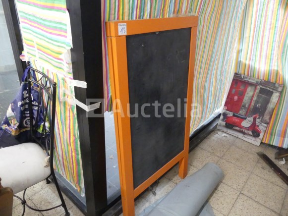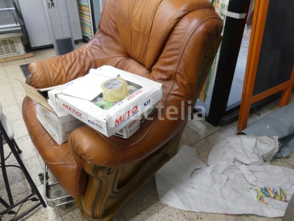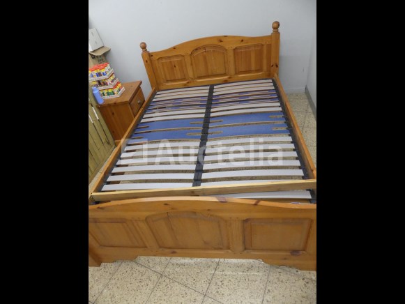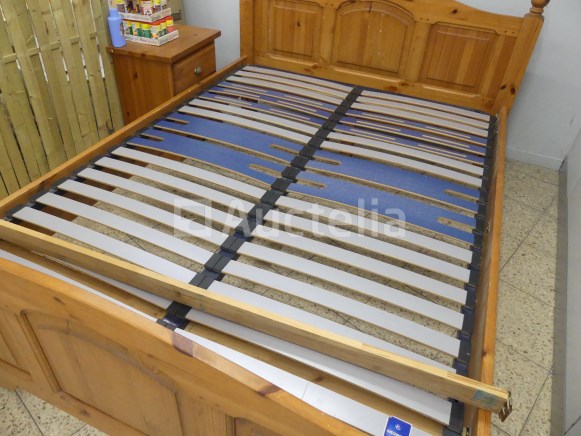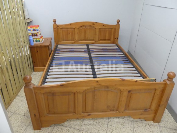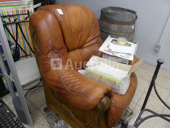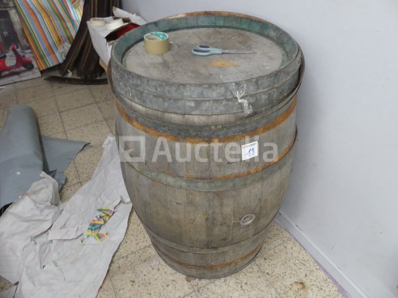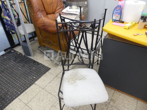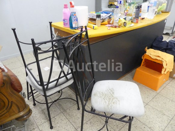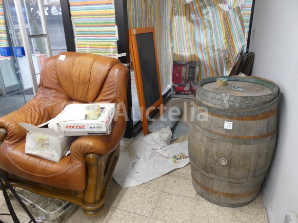 Lot waaronder: 1 x 218cm x 90cm x 92cm aanrechtblad +- 4 x metalen stoelen 1 x lege wijnvat 1 x houten en imitatie leren fauteuil 1 x Tabel 1 x dubbele dennenbed met boxsprings
