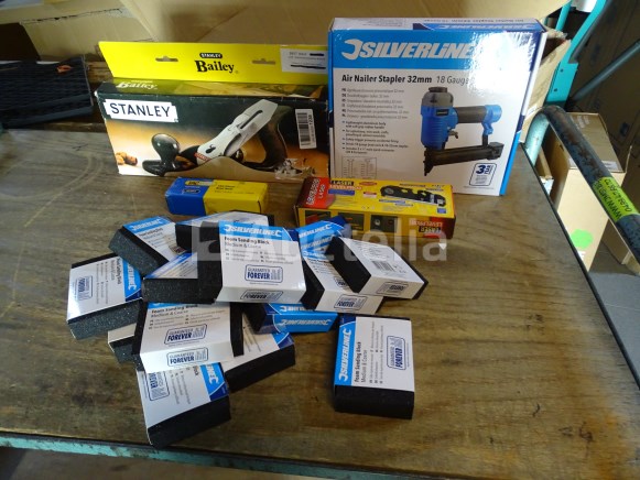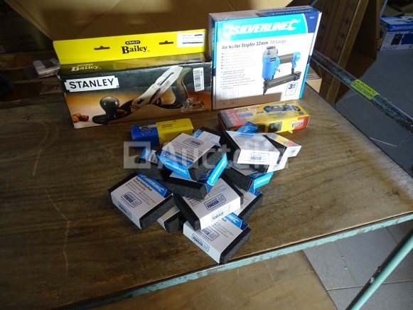 Houtbewerkingsapparatuur Details: . 1 2 in 1 32mm pneumatische nietmachine Spijkertype: 269131 . 1 Stanley Bailey Grote Schaafschaaf 1-12-005 350 mm x 50 mm . 1 Laser Niveau LEVELPRO3 . 4000 TACWISE BRAD Spijkers . 15 Schuurblokken Staat van het perceel: Nieuw Scheepvaart: Tarief B