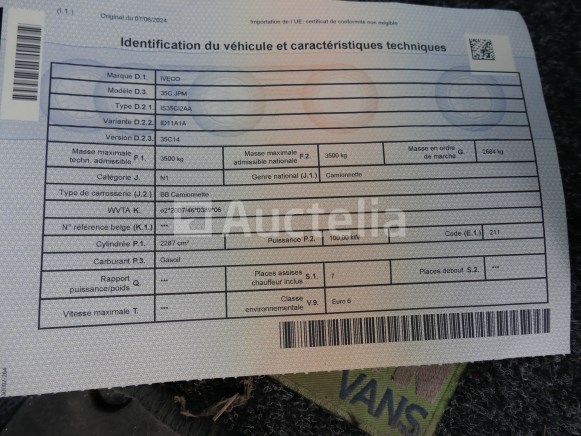 Dubbele taxibus, kiepwagen, gereedschapskist Merk: Iveco Model: 35C JPM Lengte: 684 cm Breedte: 210 cm Hoogte: 240 cm Hoeveelheid: 1 Getest: Ja Getest = werd gestart en verplaatst om foto's te maken, de container werd zonder meer in gebruik genomen Chassisnummer: ZCFCD35A405163802 Brandstof: Diesel Datum van eerste inschrijving: 25-06-2017 MMA: 3500 kg Bedrijfsgewicht: 2684 kg Cilinderinhoud: 2287 cm³ Vermogen: 100 kW Aantal zetels: 7 Milieuklas: Euro 6 Skipafmetingen: 290 cm x 203 cm x 34 cm Kilometerstand: 133567 6-versnellingsbak handgeschakeld Elektrische ramen, achteruitrijcamera Documenten: - Registratiecertificaat Deel I en II - Verblijfscertificaat aan de CT geldig tot 30-05-2026 - Conformiteitscertificaat Opmerkingen: Aanbevolen bezoek