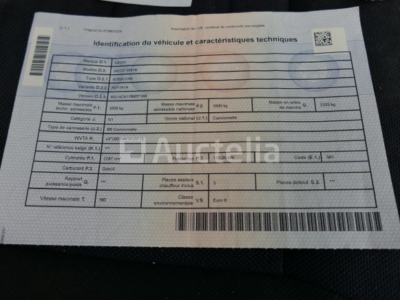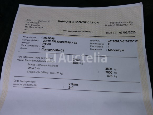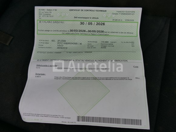 Bestelwagen Merk: Iveco Model: IVECO 35S 16 Gewicht: 2750 kg Hoeveelheid: 1 Getest: Ja Getest = het voertuig is gestart en verplaatst voor foto's zonder verdere opnames Chassisnummer: ZCFC135B305242895 Datum van eerste inschrijving: 28-08-2018 Kilometerstand: 180372 km Brandstof: Diesel MMA: 3500 kg Bedrijfsgewicht: 2333 kg Cilinderinhoud: 2287 cm³ Vermogen: 115 kW Milieuklas: Euro 6 6-versnellingsbak handgeschakeld Aantal zetels: 3 Afmetingen van de carrosserie: 345 cm x 170 cm x 180 cm (hoogte van de deuropening) Documenten; - Registratiecertificaat Deel I en II - Verblijfscertificaat aan de CT geldig tot 30-05-2026 - Identificatierapport Notities: De motor werd eind 2022 vervangen, zie factuur op de foto Aanbevolen bezoek