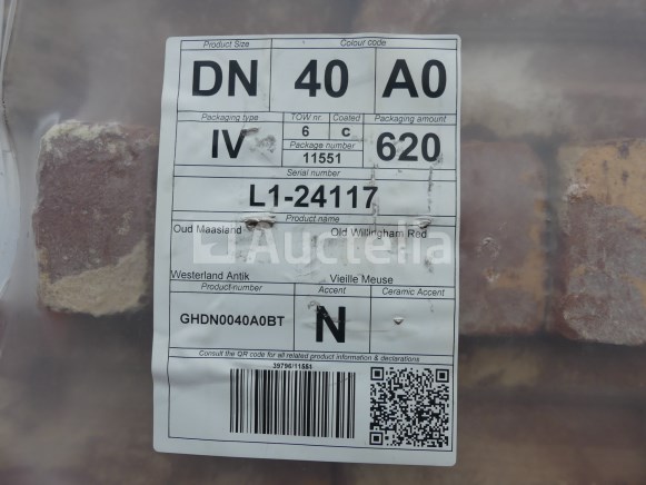 Baksteen Merk: Vandersanden Model: Oude Maas Lengte: 21,5 cm Breedte: 10 cm Hoogte: 6 cm Aantal: 1860 Verspreid over 3 pallets