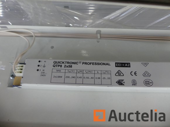 Neonbuislampen Merk: Osram Spanning: 230V Mono Lengte: 157 cm Breedte: 18 cm Hoogte: 10 cm Aantal: +/- 47 Getest: Nee Model: Quicktronic Model: QTP8 2x58 Notities: Gepalleteerde partij