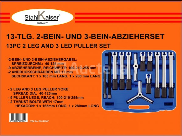 Trekker set 2 - en 3-armige dwarsarmen. Trekdiepte 105 - 210 mm en 265 mm, trekpoten zijn geschikt voor 2- en 3-poots dwarsbalken, trekkerbreedte tot 135 mm. Vrij bewegende poten maken inwendige en uitwendige trekhandelingen mogelijk, geharde trekvoeten (breedte ca. 25 mm, dikte ca. 4 mm), en 2 spillen ongeveer. 165 mm en 280 mm met schroefdraad M14 x 1,5 mm. Verwisselbare, speciaal geharde trek armen ( 25 mm breed, dikte 2 mm) Staat: nieuw
