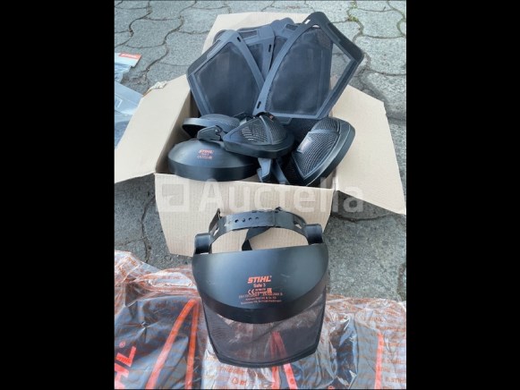 Set persoonlijke beschermingsuitrusting voor tuinieren Merk: Stihl Compositie: 3x borstelschaar-ondersteuningsharnas Nieuw in originele verpakking 10 x Anti-Spray Vizier Nieuw in originele verpakking Opmerkingen: Aanbevolen bezoek