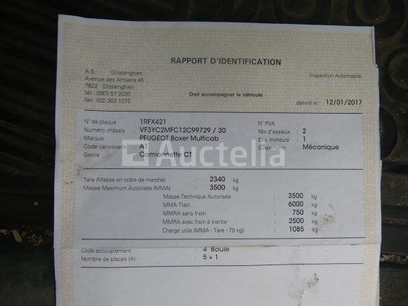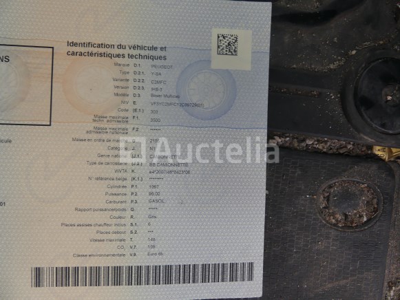 Bestelwagen Merk: Peugeot Model: Boxer multicab Jaar: 2016 Lengte: 600 cm Breedte: 205 cm Hoogte: 252 cm Vermogen: 96 kW Datum van eerste inschrijving: 13-12-16 Brandstof: Diesel Verplaatsing (cc): 1997 Versnellingsbak: Handgeschakeld MMA: 3500 kg Eigengewicht: 2340 kg Wielbasis: 403 cm Ophanging: Mechanisch Radio: Ja Achteruitrijdende radar: Ja Aantal toetsen: 1 Aantal zetels: 6 Certificaat van conformiteit: Ja Technisch keuringscertificaat: Ja Technisch keuringscertificaat geldig tot: 26-12-12 Registratiecertificaat Deel 1: Ja Identificatierapport: Ja Voertuig nog in gebruik (kilometerstand verandert): Nee Chassisnummer: VF3YC2MFC12C99729 Eurostandaard: 6b Conditie: Niet getest Notities: Aanbevolen bezoek Het voertuig is tijdens de inventarisatie niet grondig geïnspecteerd en kan niet-zichtbare defecten hebben. De koper zou het perceel vóór de aankoop hebben bezocht om eventuele afhandeling voor de incasso van zijn perceel te plannen