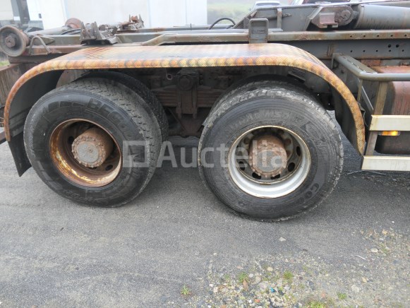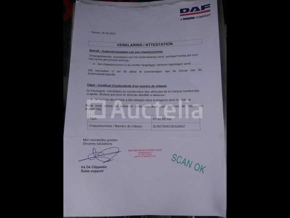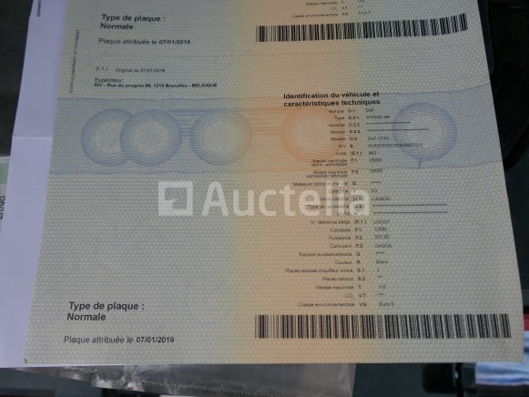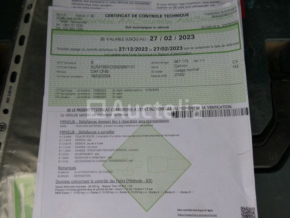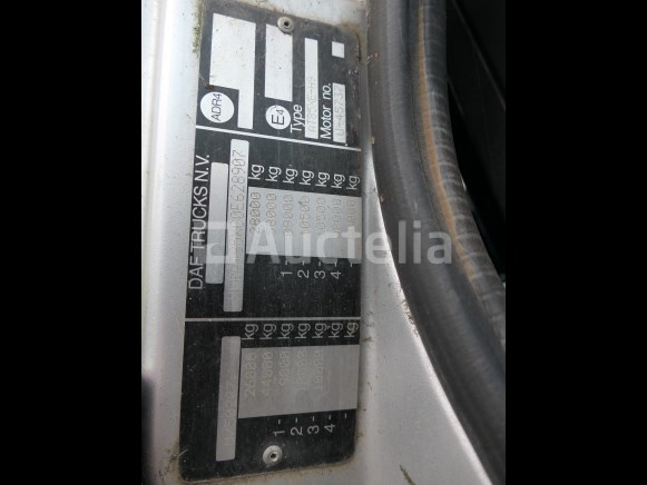 Containervrachtwagen Merk: DAF Jaar: 2004 Kilometerstand: 576578 Lengte: 760 cm Breedte: 250 cm Vermogen: 355 kW Datum van 1e inschrijving: 16-02-04 Brandstof: Diesel Cilinderinhoud (cc): 12580 MMA: 26.000 kg Aantal zetels: 2 Certificaat van conformiteit: Ja Technisch keuringscertificaat: Ja Technisch keuringscertificaat geldig tot: 27-02-23 Registratiecertificaat Deel 1: Ja Registratiebewijs Deel 2: Ja Vrachtwagengegevens: Ja Voertuig nog in gebruik (kilometerstand verandert): Nee Chassisnummer: XLRAT85XCOE628907-01 Eurostandaard: 3 Staat: Te renoveren Het containerliftsysteem moet worden gerepareerd (hydraulisch lekkage), reparatie van hydraulische slangen moet worden gepland Algemene toestand: zichtbare oxidatie, deze vrachtwagen werd gebruikt voor zoutsmeeren Het voertuig is tijdens de inventarisatie niet grondig geïnspecteerd en kan niet-zichtbare gebreken hebben Opmerkingen: Bezoek wordt aanbevolen, om te worden gereconditioneerd (oxidatie op verschillende plaatsen)