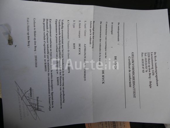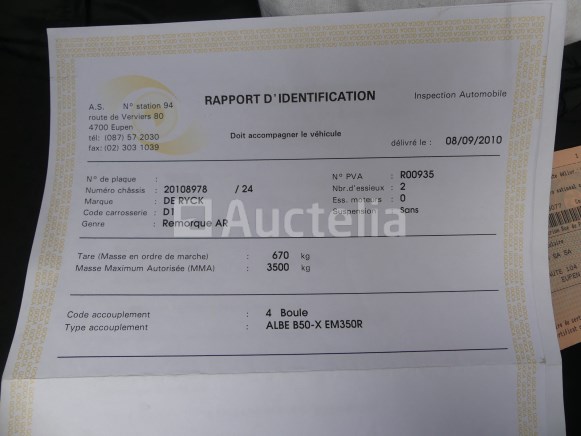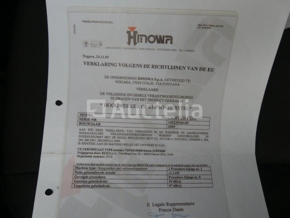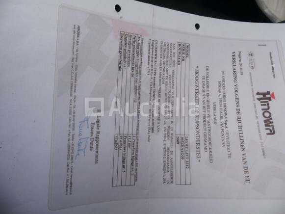 Crawler spider platform Merk: Hinowa Model: Light Lift 23.12 Jaar: 2009 Lengte: 605 m Breedte: 150 m Hoogte: 205 m Gewicht: 3100 kg Vermogen: 11,2 kW Werkhoogte: 23,2 m Capaciteit: 200 kg Conditie: Niet getest Horizontale reikwijdte: 1160 cm Bi-energie Elektrische + Honda IGX440 verbrandingsmotor Geleverd met bedrade afstandsbediening Chassisnummer: 10523IN4G09 Aanbevolen bezoek Opmerkingen: Ophalen op afspraak Dubbelassige aanhanger Merk: De Ryck Model: R35T Jaar: 2010 Datum van eerste inschrijving: 15-04-10 MMA: 3500 kg Tare: 670 kg Certificaat van conformiteit: Ja Technisch keuringscertificaat: Ja Technisch keuringscertificaat geldig tot: 18-08-08 Registratiecertificaat Deel 1: Ja Registratiecertificaat Deel 2: geen Chassisnummer: 20108978 Aanhanger voor het vervoeren van het Hinowa LL23.12 luchtwerkplatform Geleverd zonder kenteken Aanbevolen bezoek Opmerkingen: Ophalen op afspraak