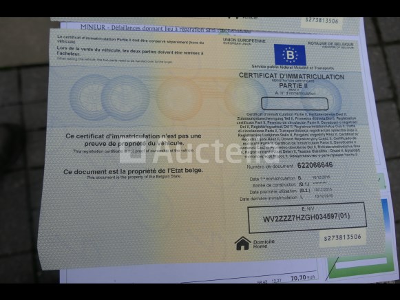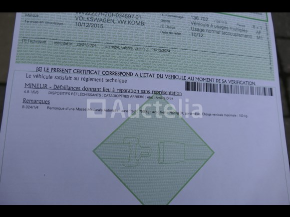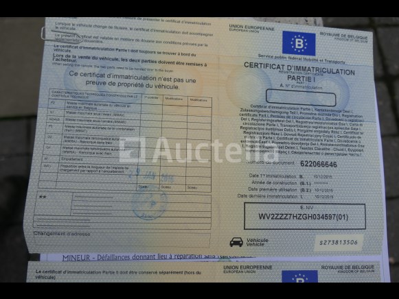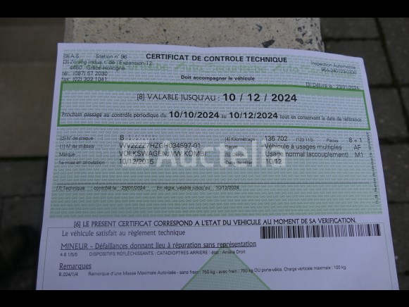 Bestelwagen Merk: Volkswagen Model: Kombi Jaar: 2015 Lengte: 490 cm Breedte: 190 cm Hoogte: 195 cm Gewicht: 1868 kg Vermogen: 110 kW Datum 1e inschrijving: 10-12-15 Brandstof: Diesel Verplaatsing (cc) : 1968 Versnellingsbak: Handgeschakeld Aantal toetsen: 1 Aantal zitplaatsen: 9 Certificaat van overeenstemming: Ja Certificaat technische keuring: Ja Technisch keuringscertificaat geldig tot: 10-12-24 Bewijs van inschrijving deel 1: Ja Bewijs van inschrijving deel 2: Ja Voertuig nog in dienst (kilometerstand evolueert): Nee Chassisnummer: WV2ZZZ7HZGH03597 Euronorm: 6b Staat: Niet getest Het voertuig heeft tijdens de inventarisatie geen grondige inspectie ondergaan en kan niet-zichtbare gebreken vertonen Laatst bekende kilometerstand: 136702 km per 23-01-2024 Voertuig uitgerust met een trekhaak Opmerkingen: Aanbevolen bezoek