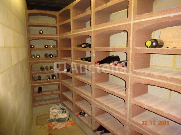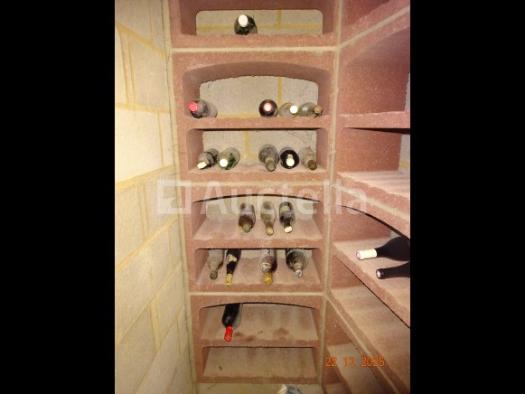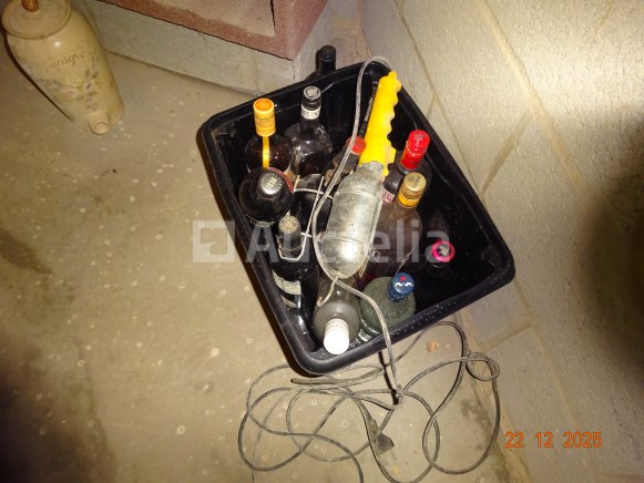 De hele wijnkelder: +/- 35 flessen geplaatst in de wijnnissen De inhoud van twee PVC-manna's met verschillende gesloten of geopende flessen alcohol