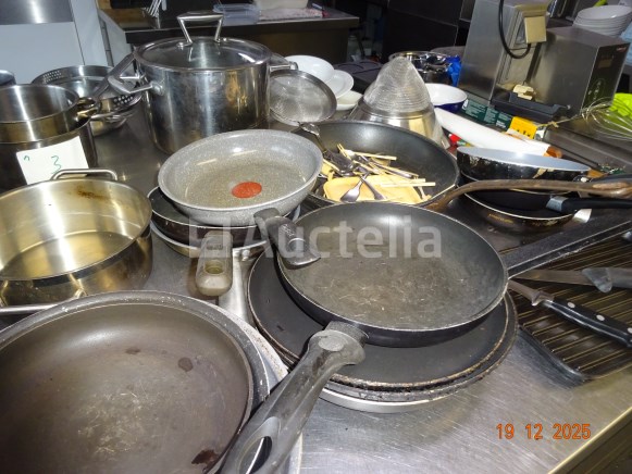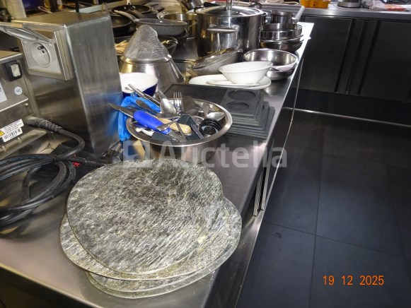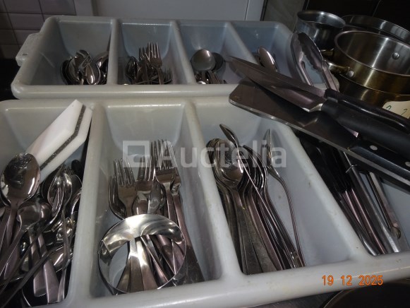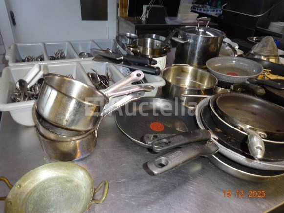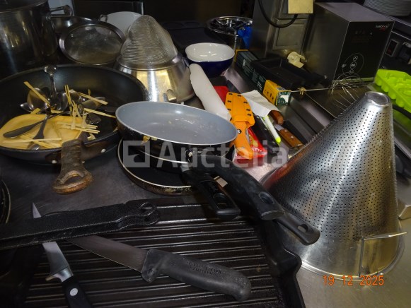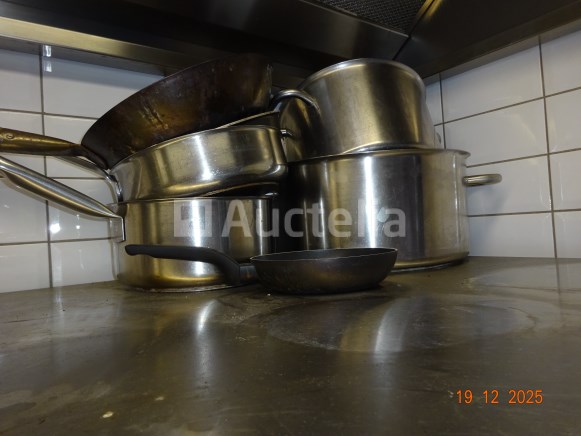 1 set pollepels hingen links van de deur 1 diverse partij, waaronder: Skillets, Potten en pannen boven de oven Messen, Forks, Lepels, Diverse gebruiksvoorwerpen 1 set roestvrijstalen schalen Kan en koffiezetapparaat op de plank achterin Opmerking: alles op het centrale aanrecht