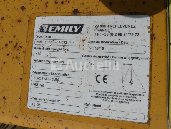 Vloerborstel voor manitou Merk: Emily Model: Baltor 250-01/032 Jaar: 2016 Lengte: 300 cm Breedte: 185 cm Hoogte: 115 cm Werkbreedte: 245 cm Staat: Niet getest Functioneel volgens verkoper Opmerkingen: Aanbevolen bezoek